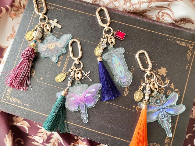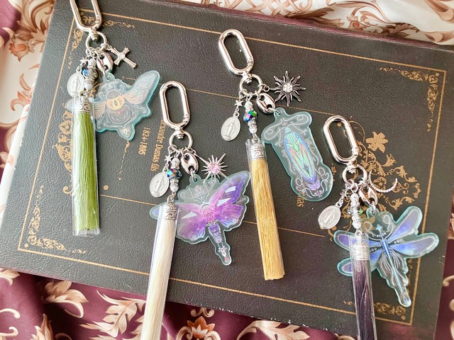 油絵画家・のせあかりさんとのコラボ商品で、アクリルチャームがついたバッグチャームです。 メダイやカラータッセルなどと、のせ氏が描いたアクリルチャームをメインデザインに仕立てました。 左から、クマバチ・ギンモンスズメモドキ、ひとつ飛んでリュウキュウハグロトンボの3種のみです。(ヤマトタマムシは無し) 海外輸入品等のパーツも使用しています。確認して製作していますが、天然ビーズの差異、小キズや曇り、塗装の小さな浮き、欠け等は素材の持つ魅力としてご理解下さいませ。 画像はイメージです。多少の個体差がございます。仕入れ状況によって、パーツが多少変更になる可能性があります。 サイズ:約10cm(金具含まず) 何かご質問等ございましたら、お気軽にお問い合わせくださいませ。