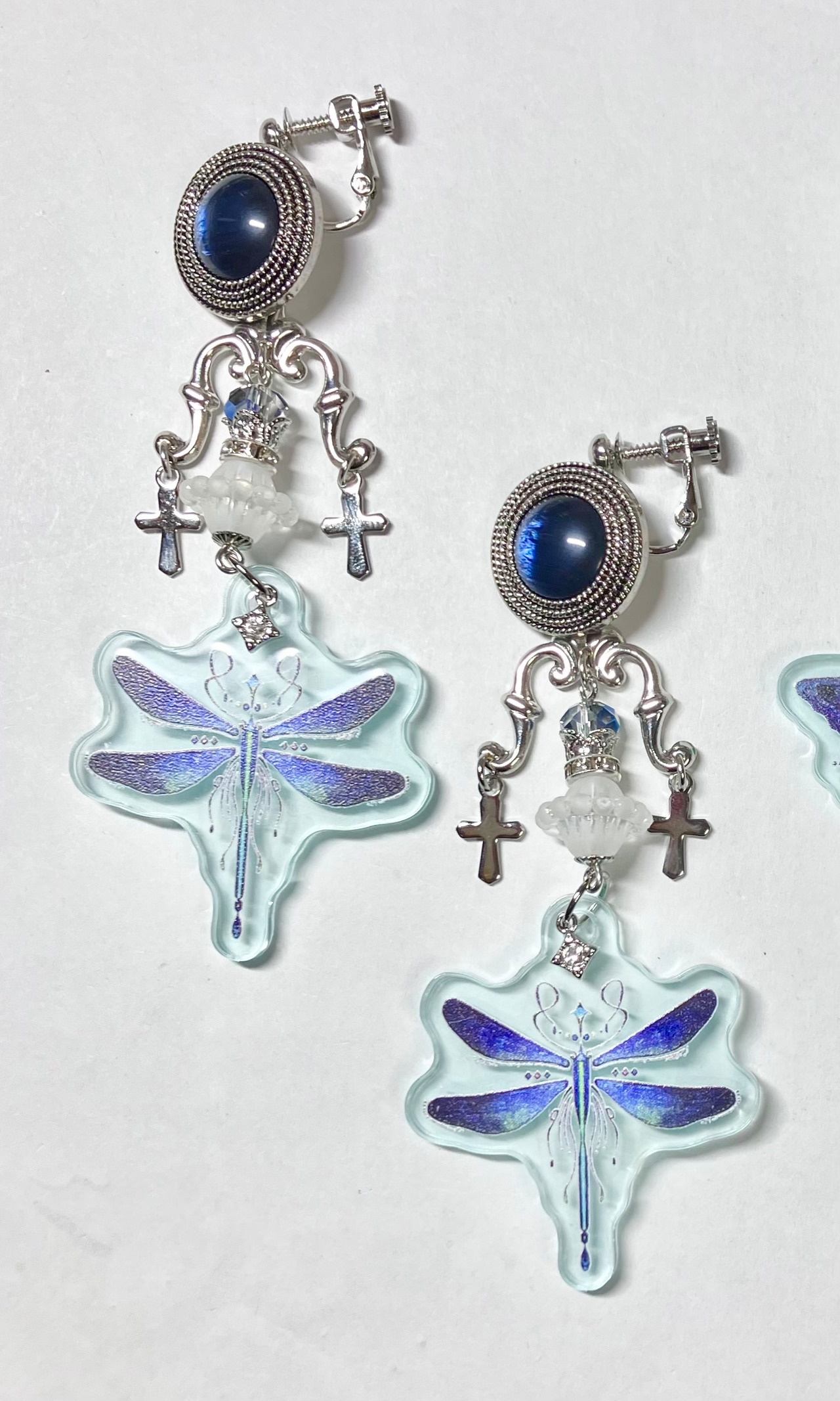 油絵画家・のせあかりさんとのコラボ商品で、リュウキュウハグロトンボのアクリルチャームがついたイヤリングです。