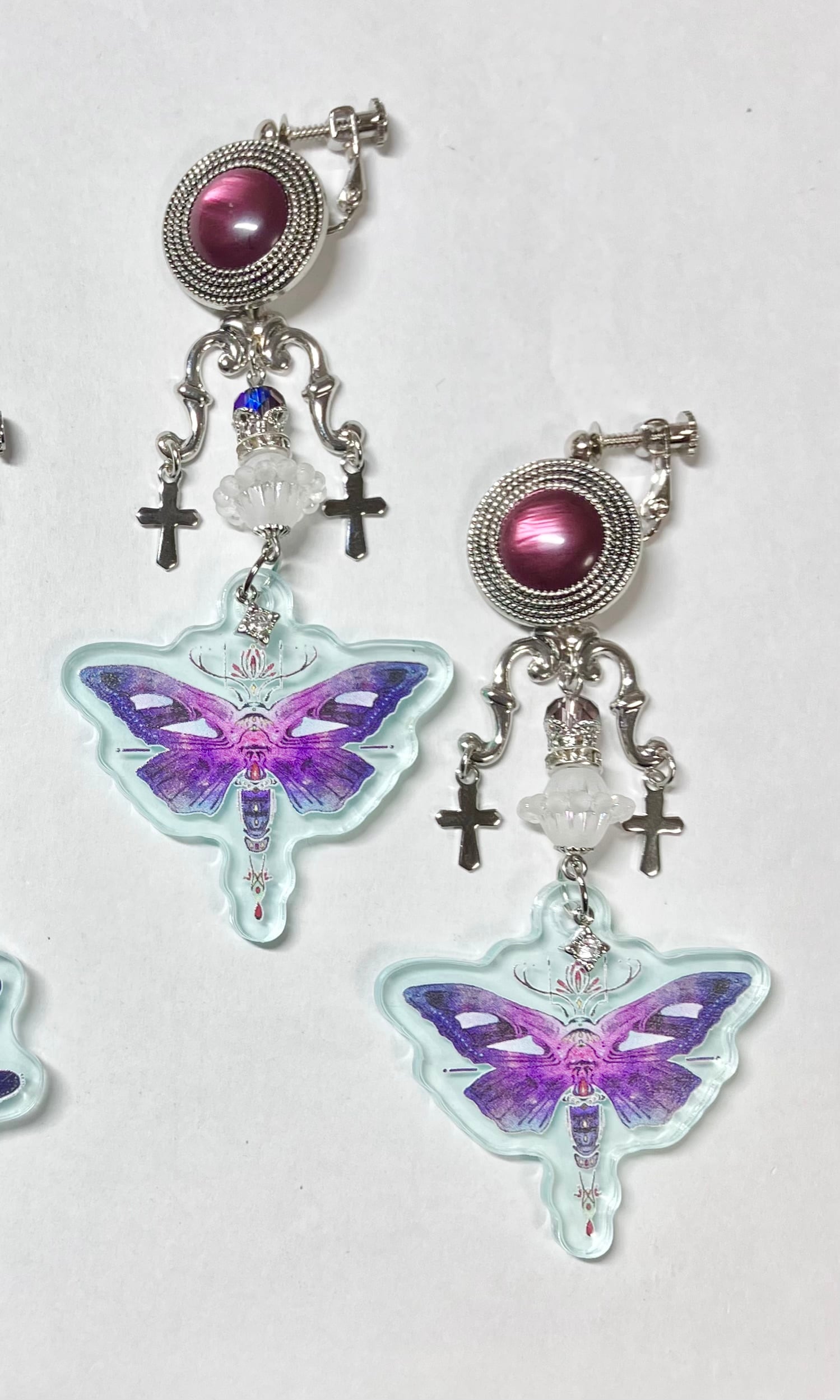 油絵画家・のせあかりさんとのコラボ商品で、ギンモンスズメモドキのアクリルチャームがついたイヤリングです。