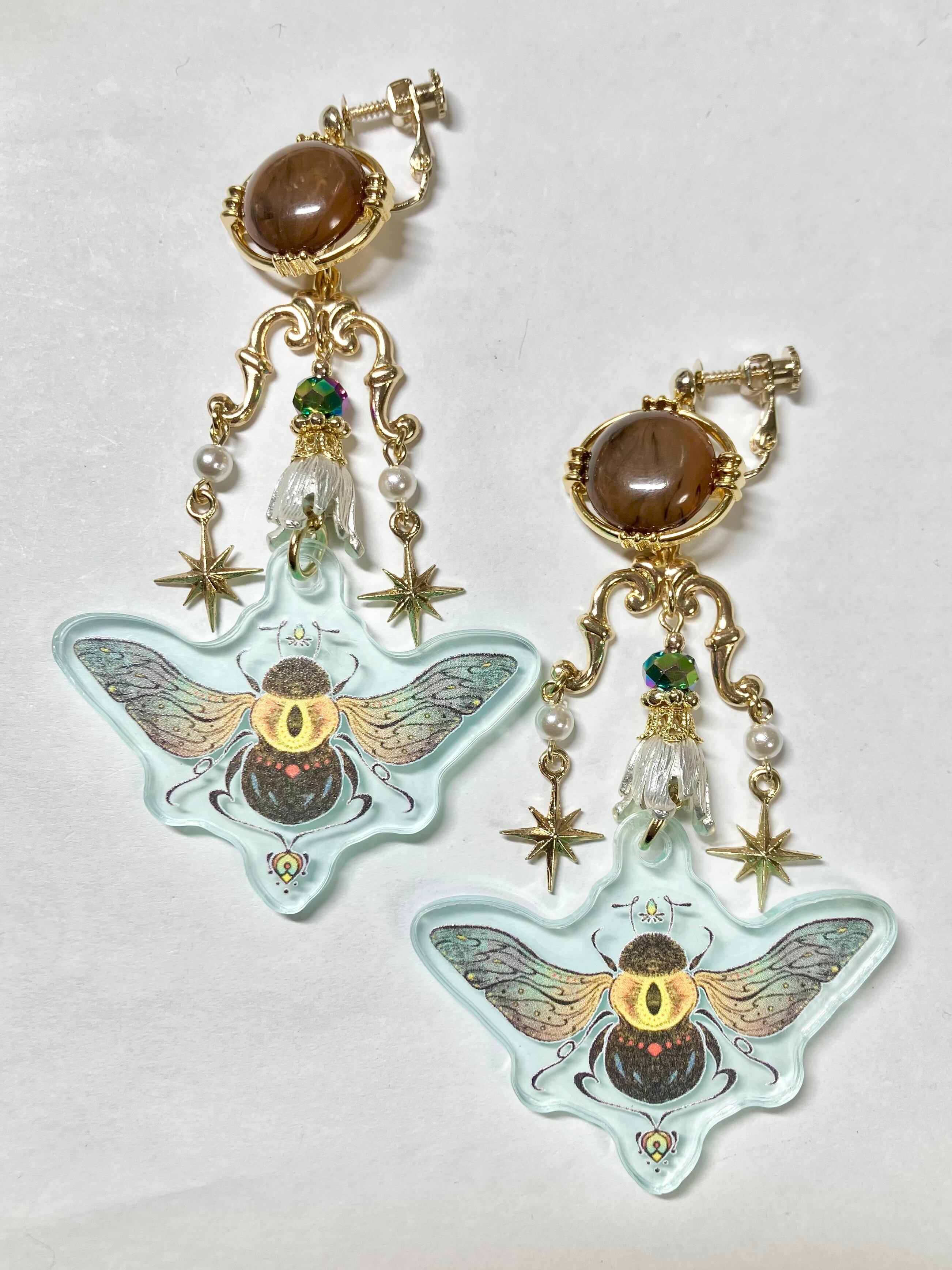 油絵画家・のせあかりさんとのコラボ商品で、クマバチのアクリルチャームがついたイヤリングです。