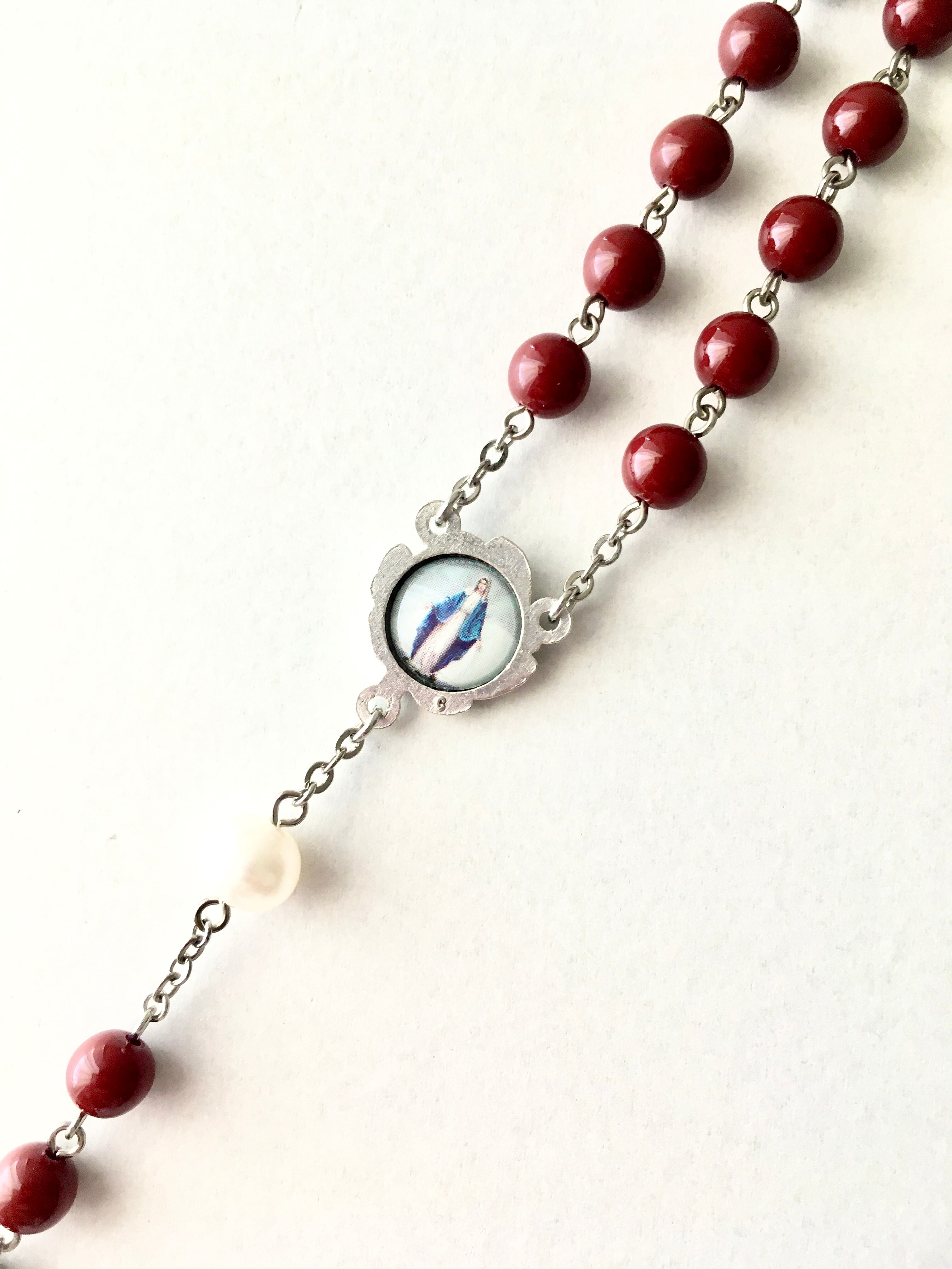 果実のようなこっくりとした赤色のビーズに淡水パールの白色が美しいロザリオです。