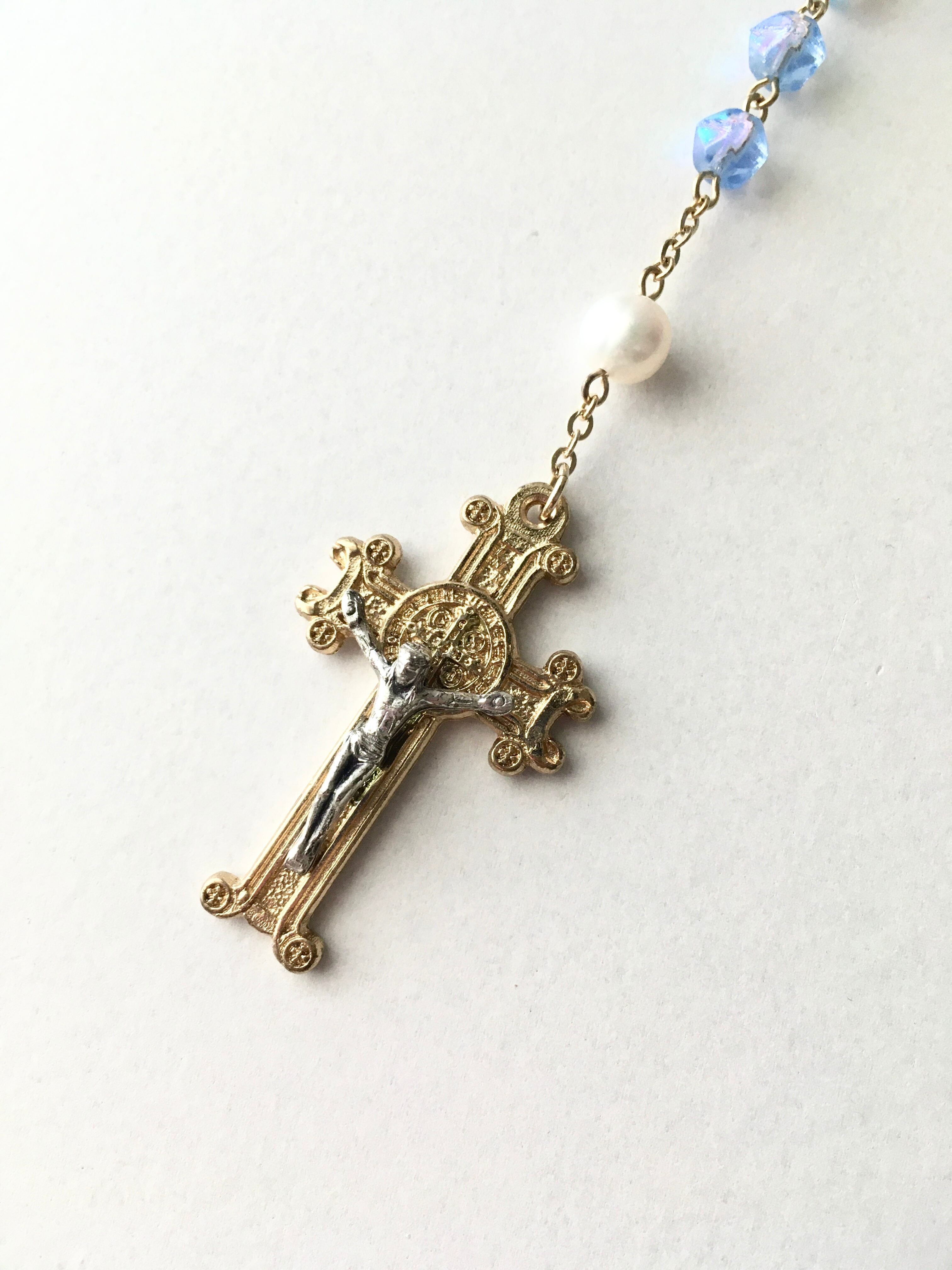 ライトサファイアブルーにオーロラ加工されたラフカットビーズに淡水パールの白色が爽やかなロザリオです。