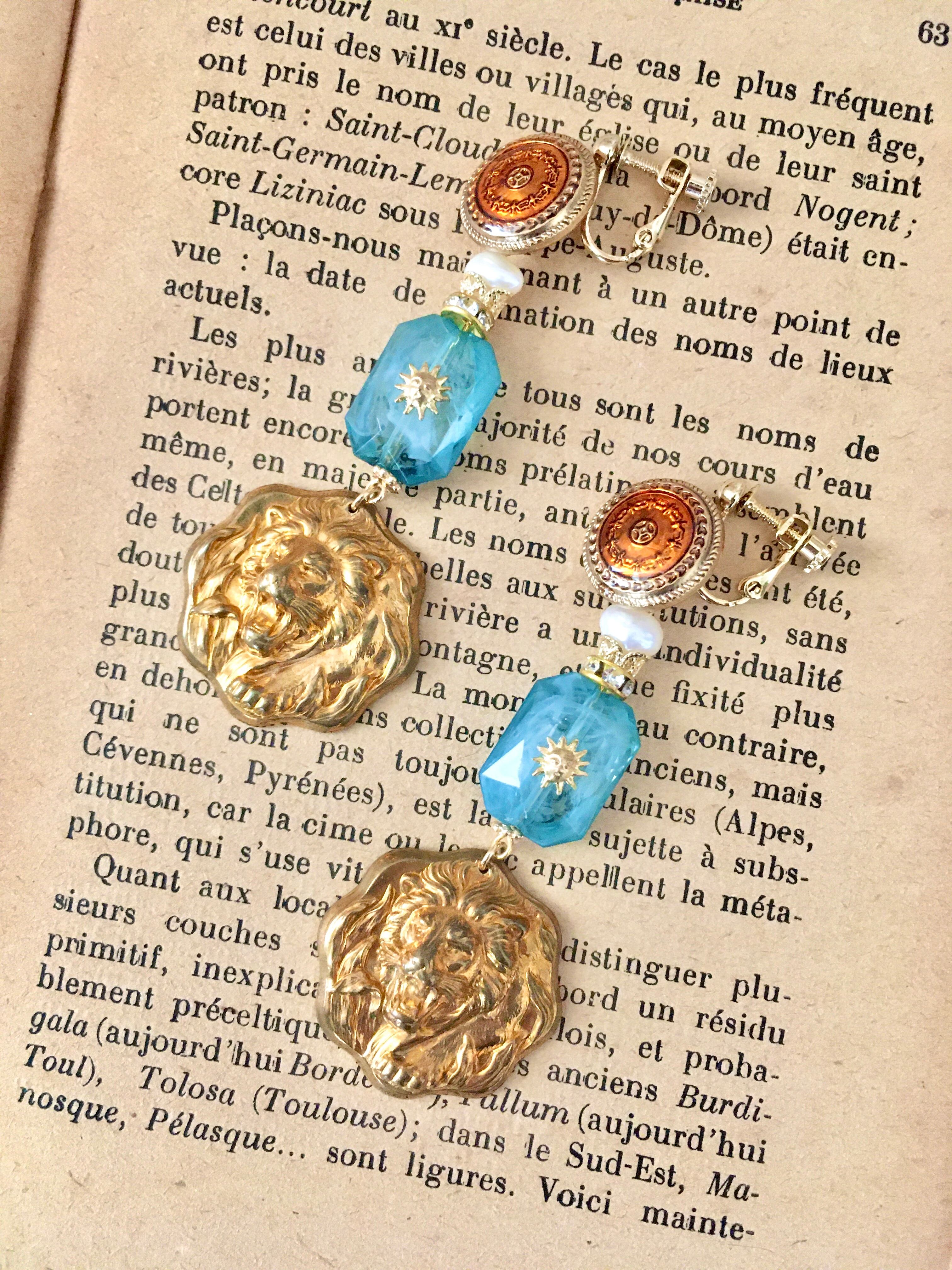 トップのボタンは夕陽のようなオレンジ色で、アクアマーブルビーズと真鍮のライオンプレートがヴィンテージライクな雰囲気を醸しているデザインです。