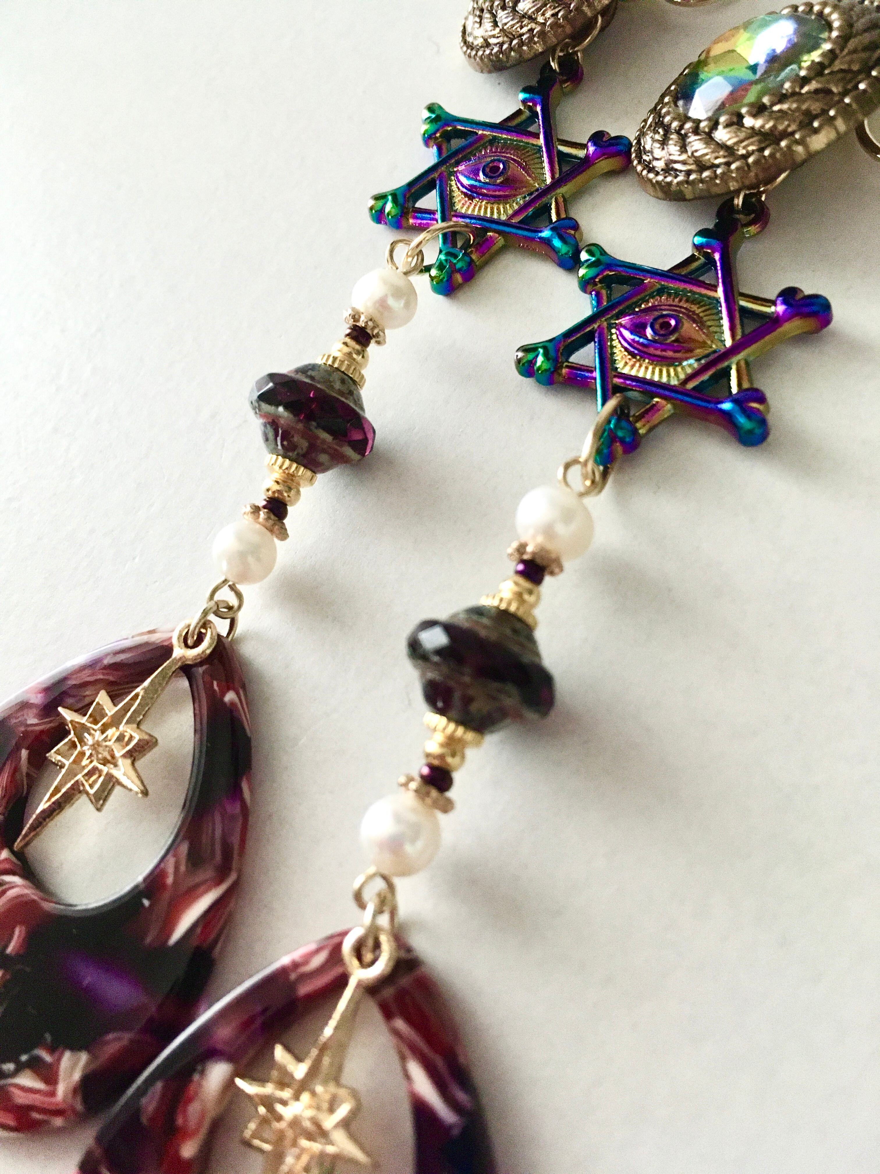 トップのボタンはゼリーような玉蟲色で、アメジストパープルの惑星ビーズとミックスカラーのアクリルプレートがミステリアスな雰囲気を醸しているデザインです。