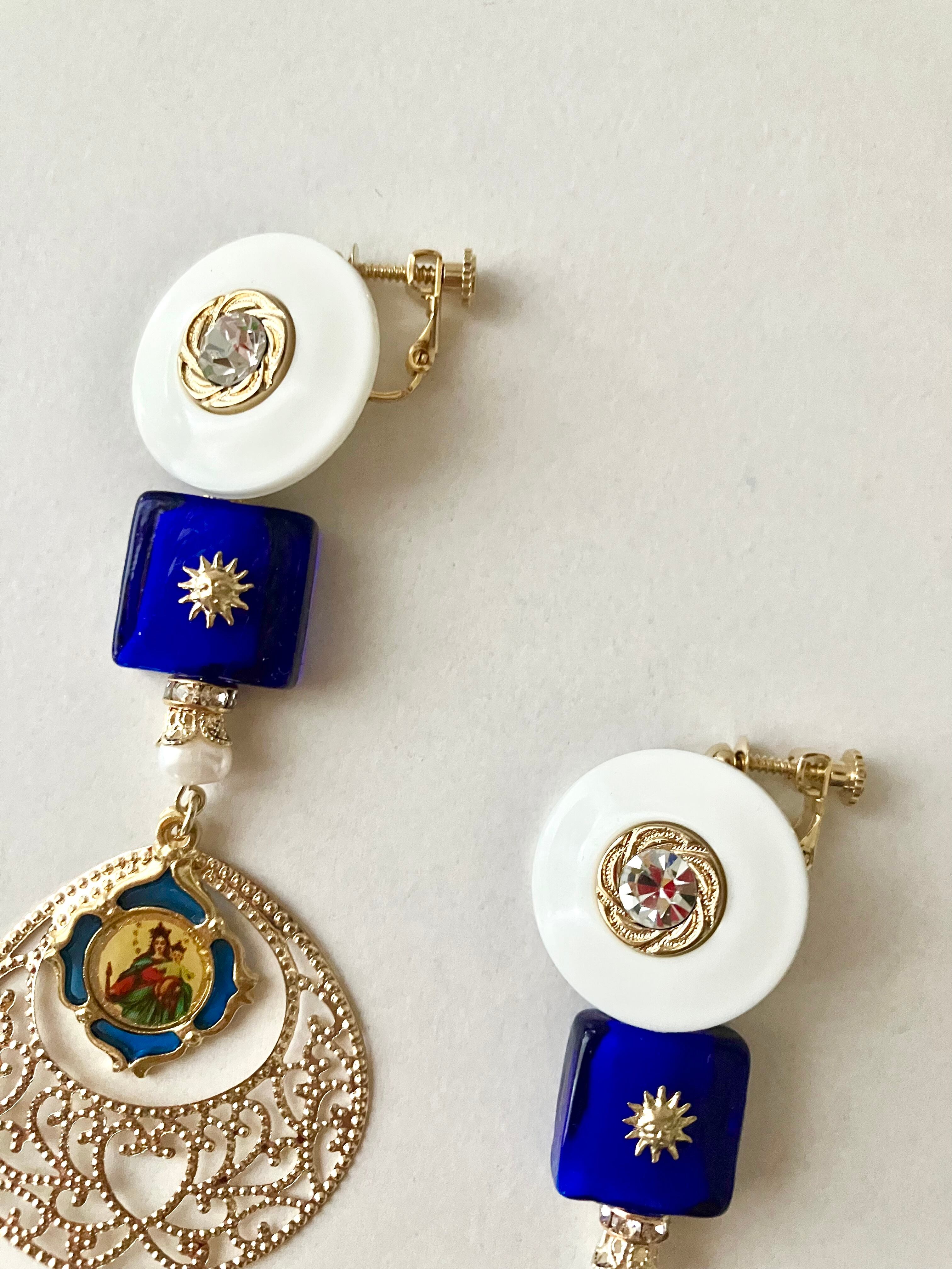 トップのボタンはクリアビジューが眩く滑らかな白を基調としたもので、目の覚めるような青いスクエアビーズとステンドグラスのようなメダイに透かしを重ねて異国の雰囲気を醸しているデザインです。