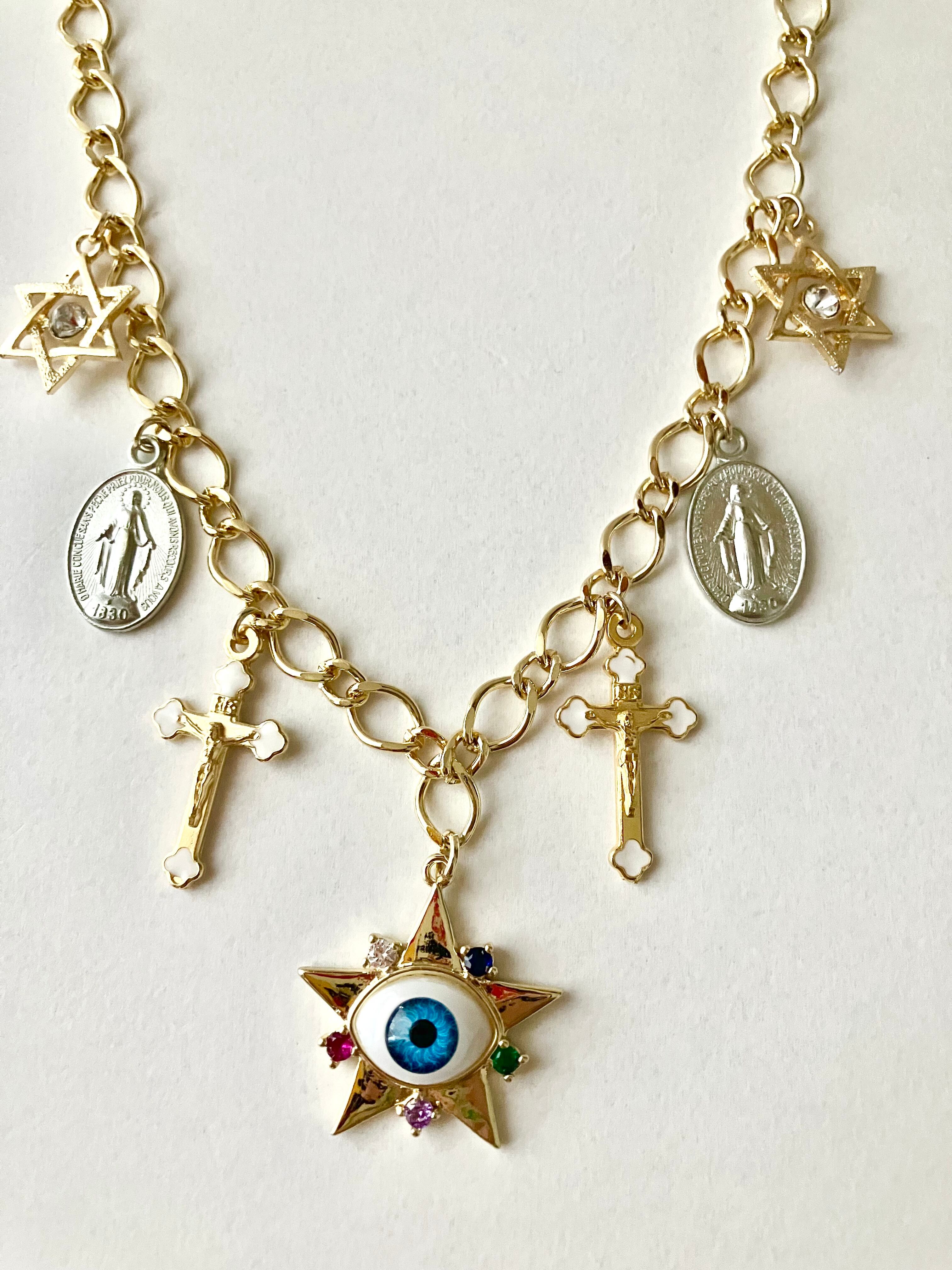 チェーンネックレスをベースに目や十字架など様々なチャームをあしらったデザインで、着けるだけで華やかになれるアイテムです。