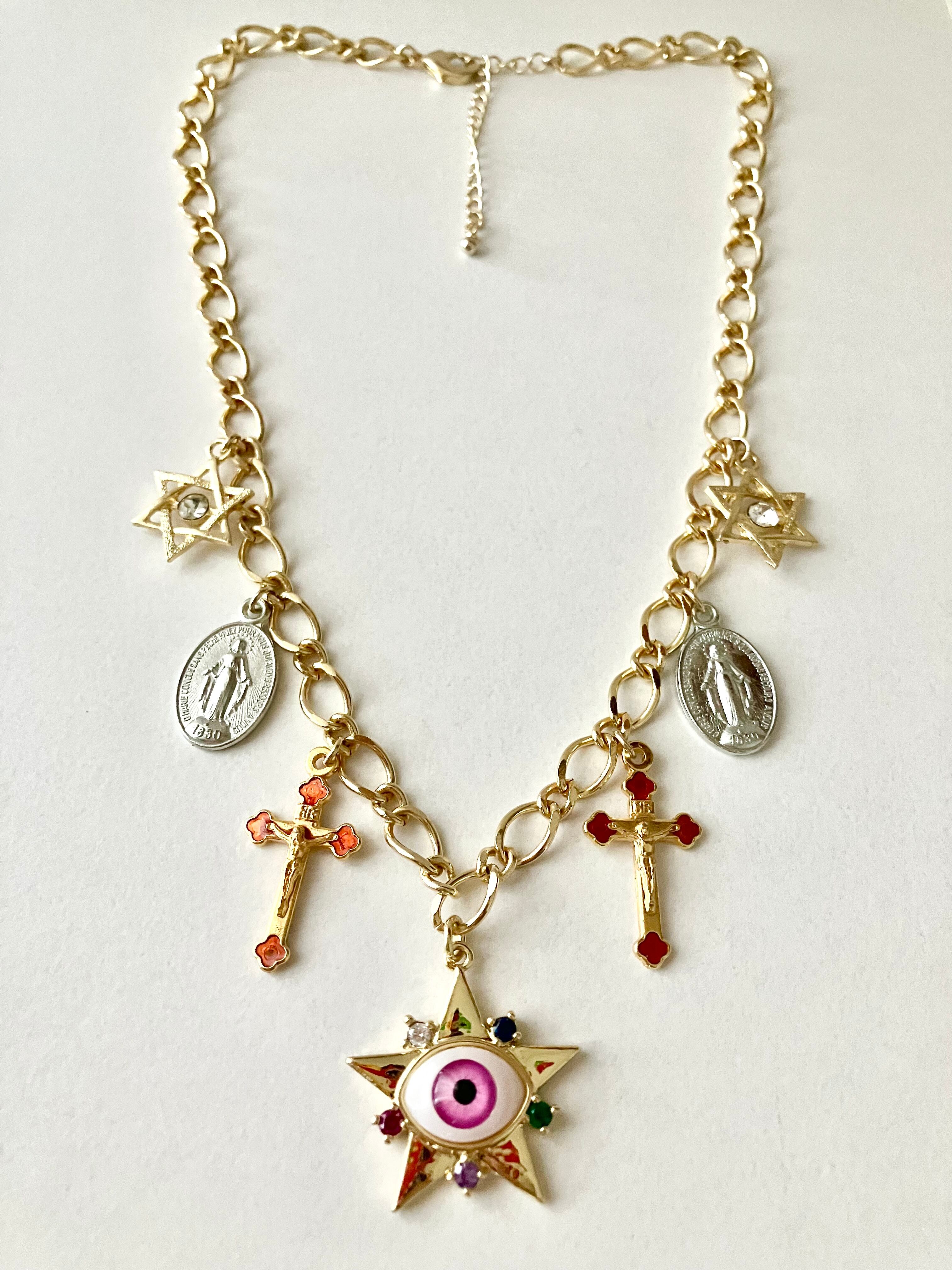 チェーンネックレスをベースに目や十字架など様々なチャームをあしらったデザインで、着けるだけで華やかになれるアイテムです。