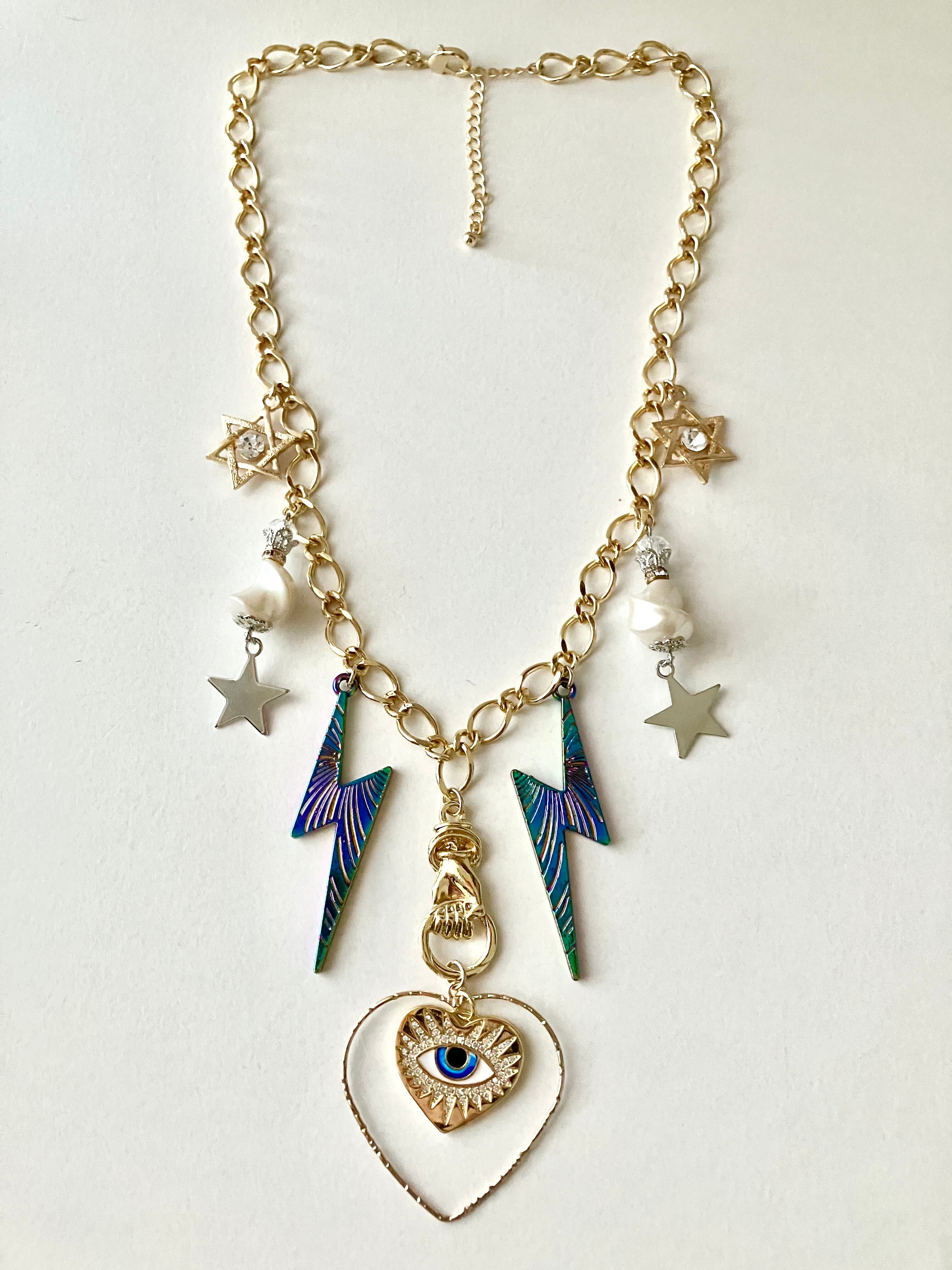 チェーンネックレスをベースにハートやイナズマなど様々なチャームをあしらったデザインで、着けるだけで華やかになれるアイテムです。