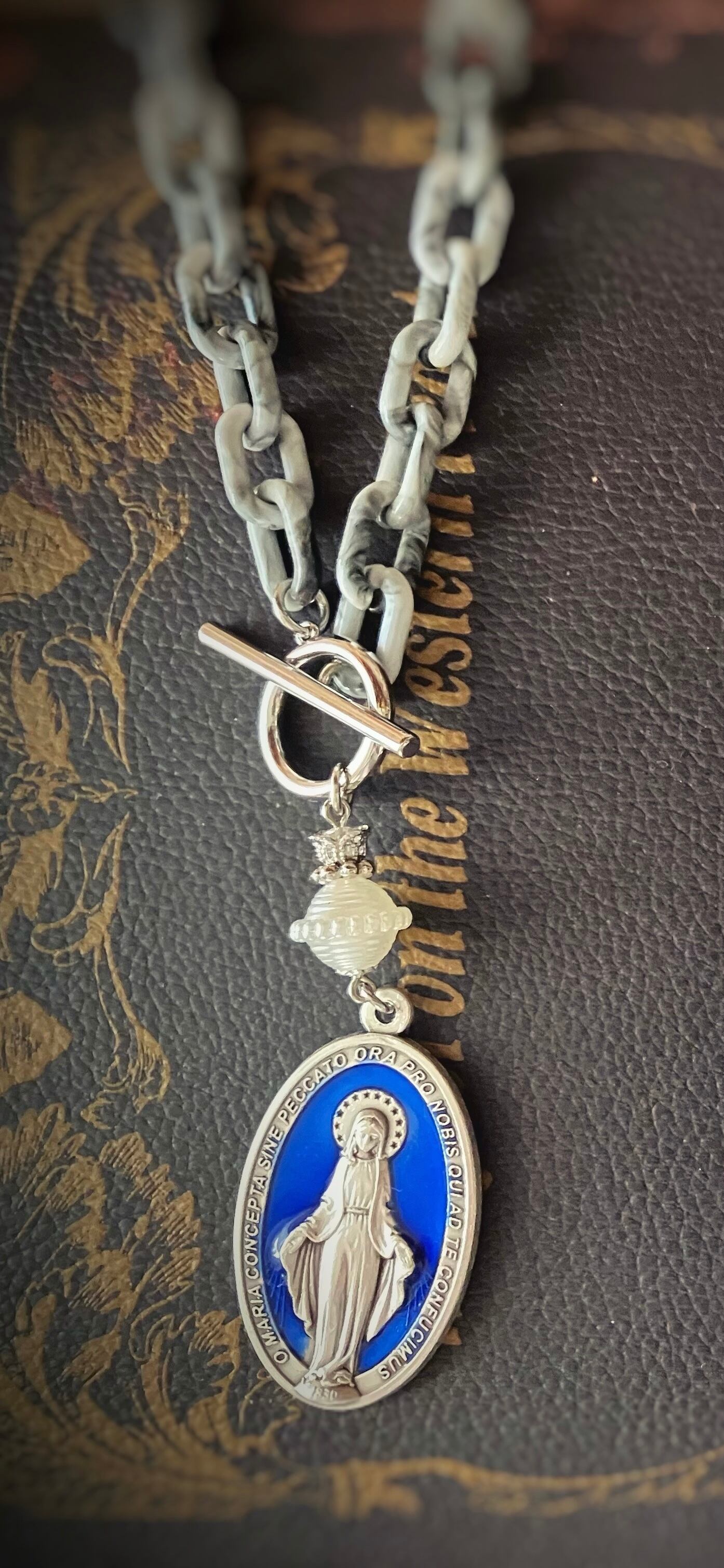 アクリルチェーンに大きめメダイをあしらった1連ネックレスです。