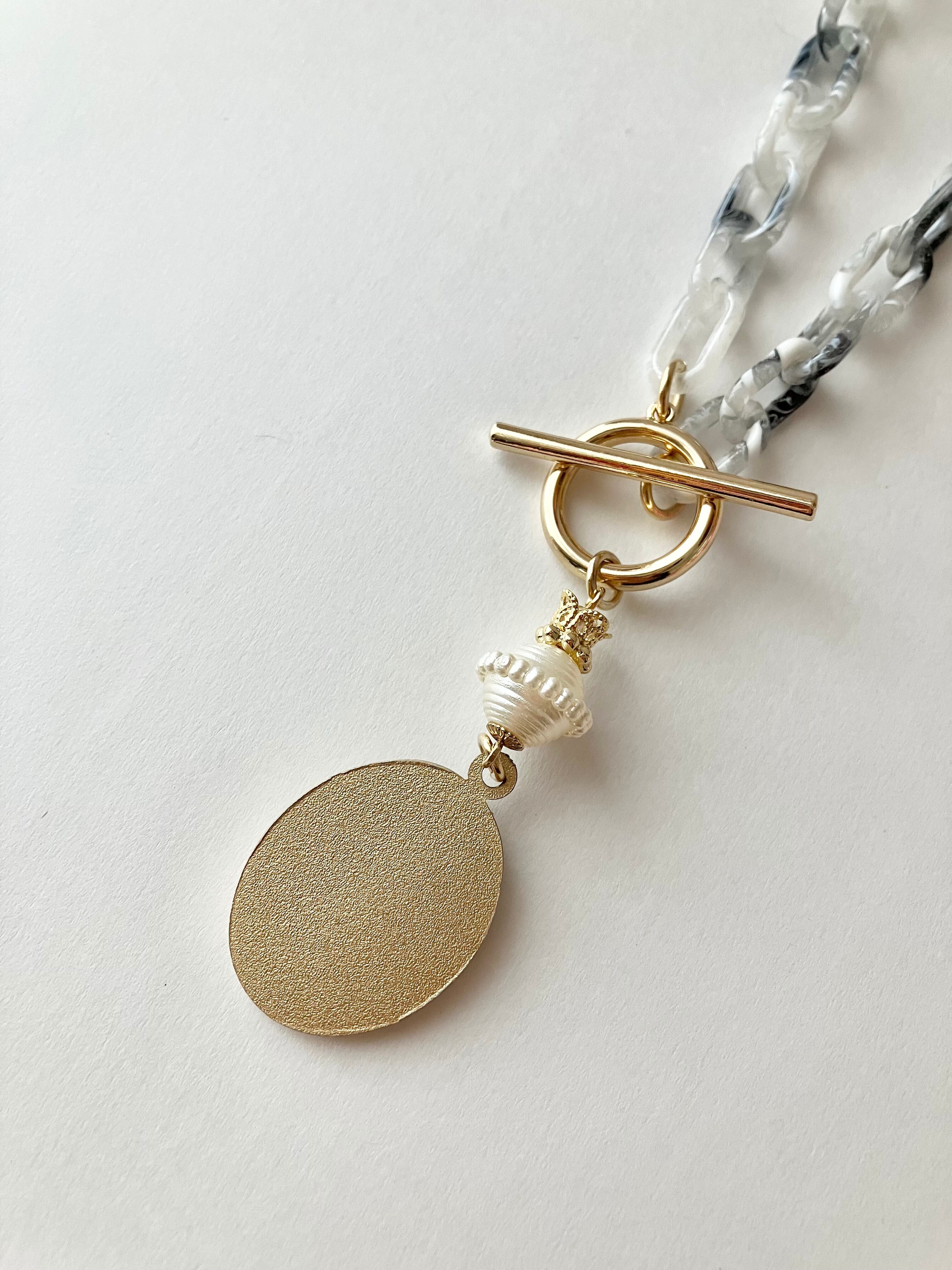 アクリルチェーンに大きめメダイをあしらった1連ネックレスです。