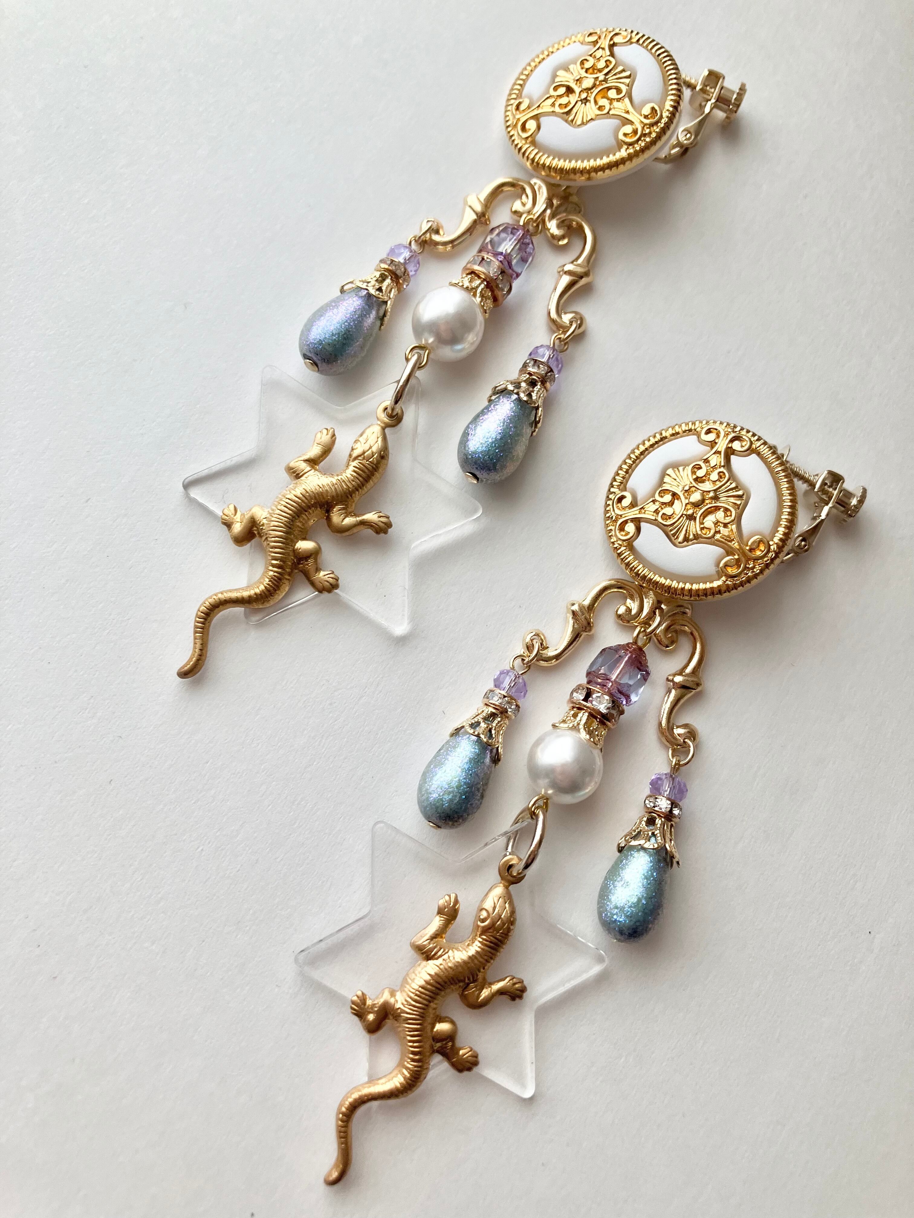 トップはヴィンテージボタンで、ゴールドを基調として真鍮のトカゲチャームとアクリルを重ね、輝きのあるアクアブルーが爽やかな雰囲気を醸しているデザインです。