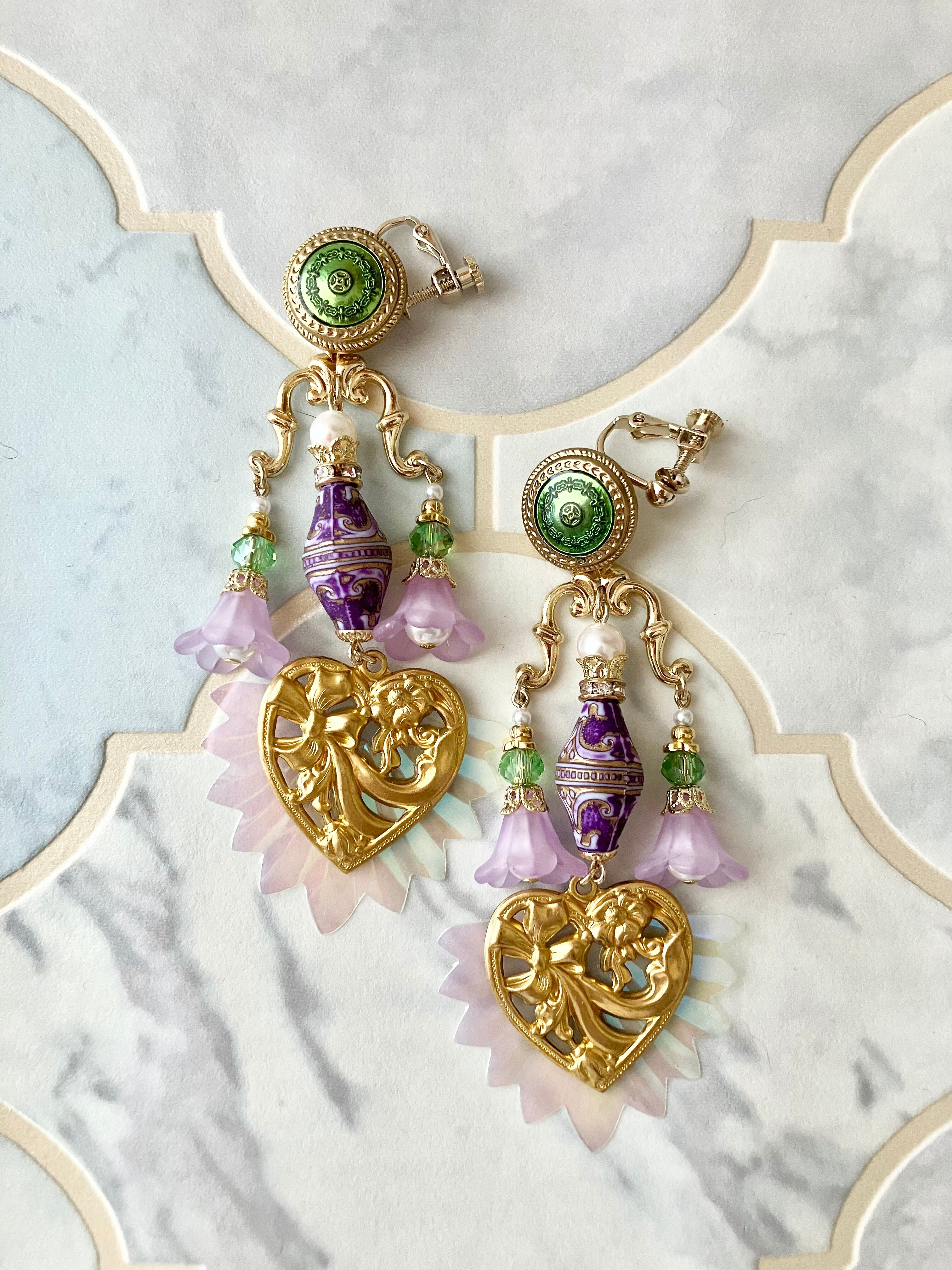 トップはヴィンテージボタンで、ゴールドを基調として真鍮のハートチャームとスパンコールプレートを重ね、紫と緑のコントラストが神秘的な雰囲気を醸しているデザインに仕立てました。
