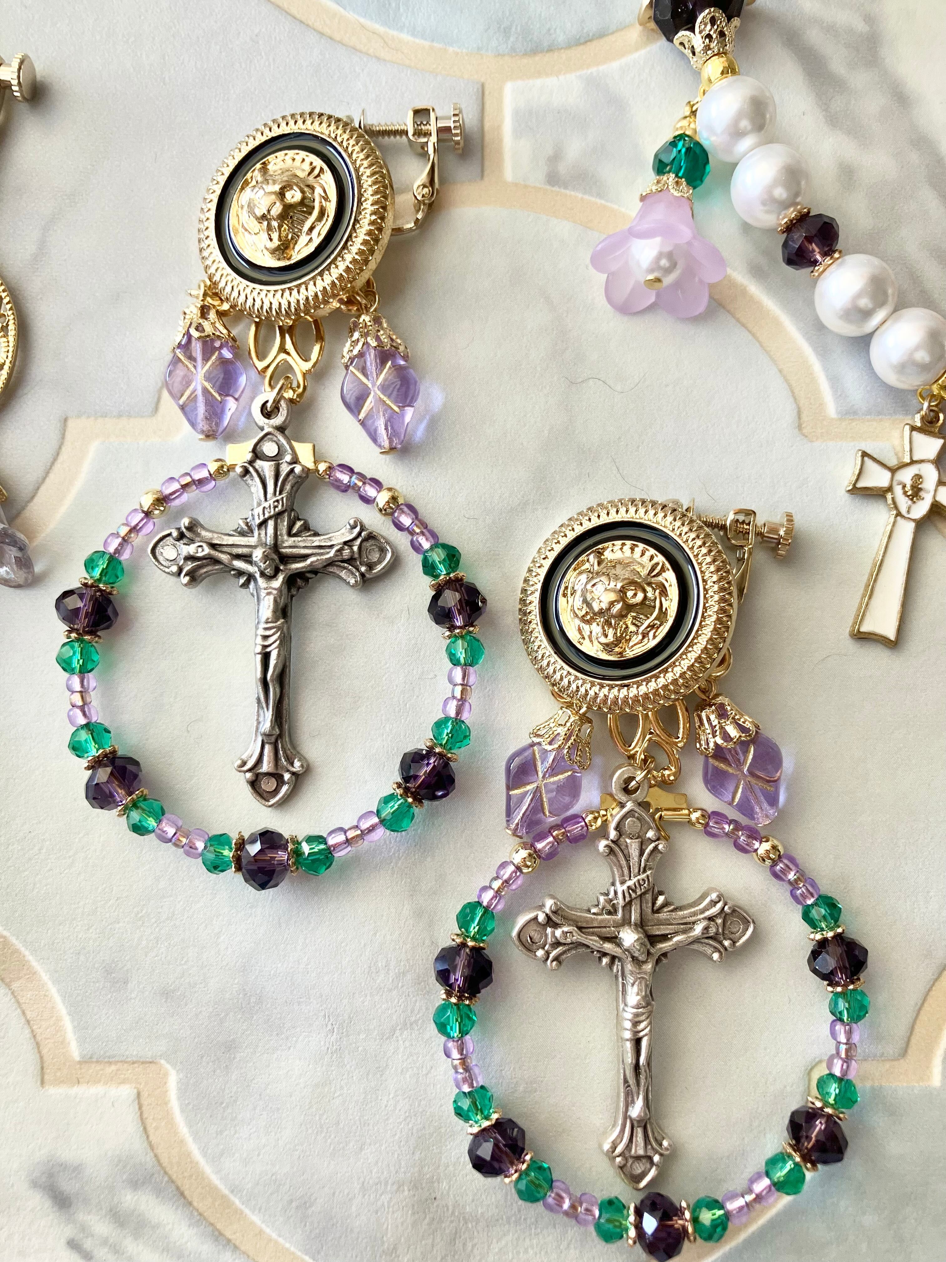 トップはヴィンテージボタンで、ゴールドを基調としてコントラストが美しい紫と緑のビーズフープを十字架チャームと合わせ、クールで神聖な雰囲気を醸しているデザインに仕立てました。
