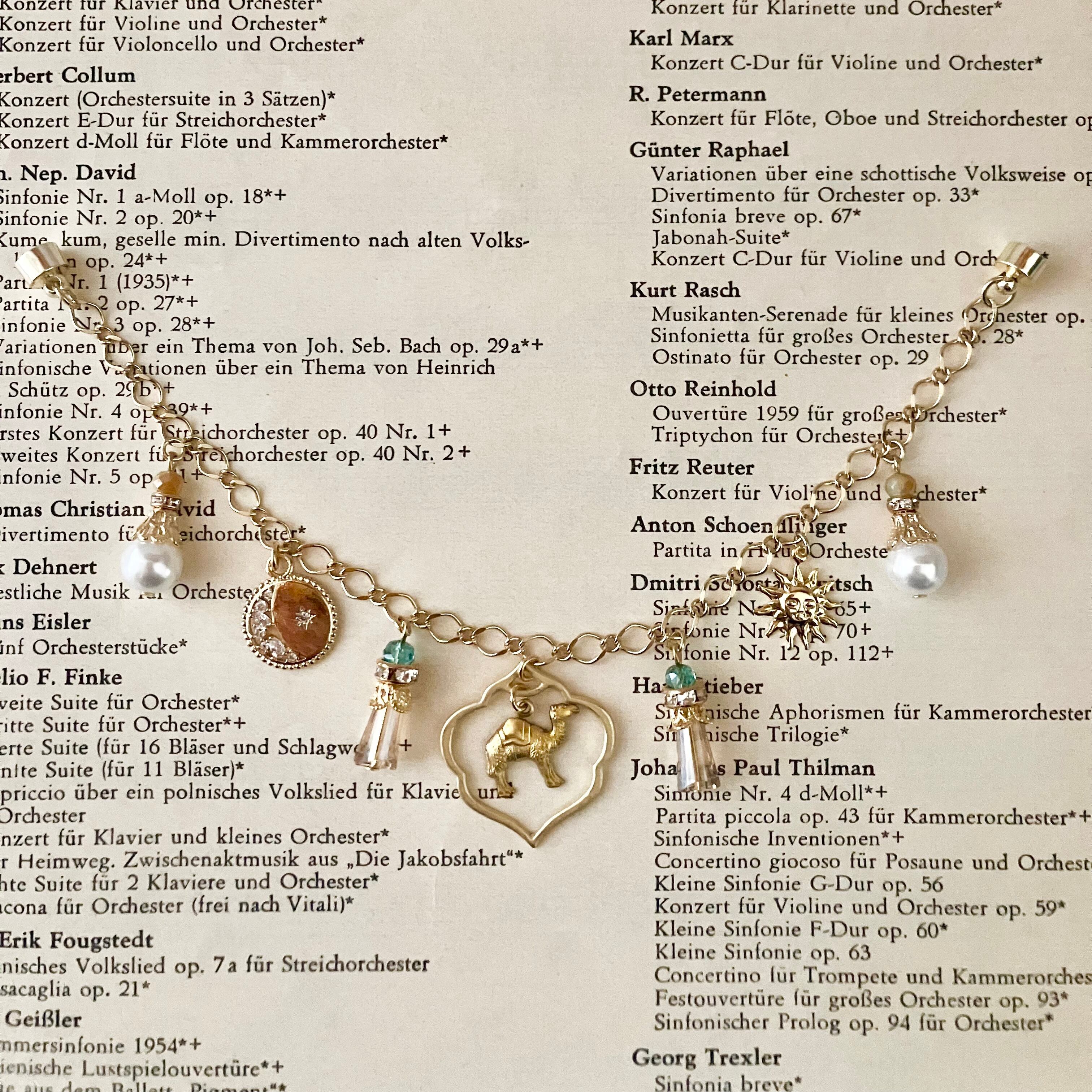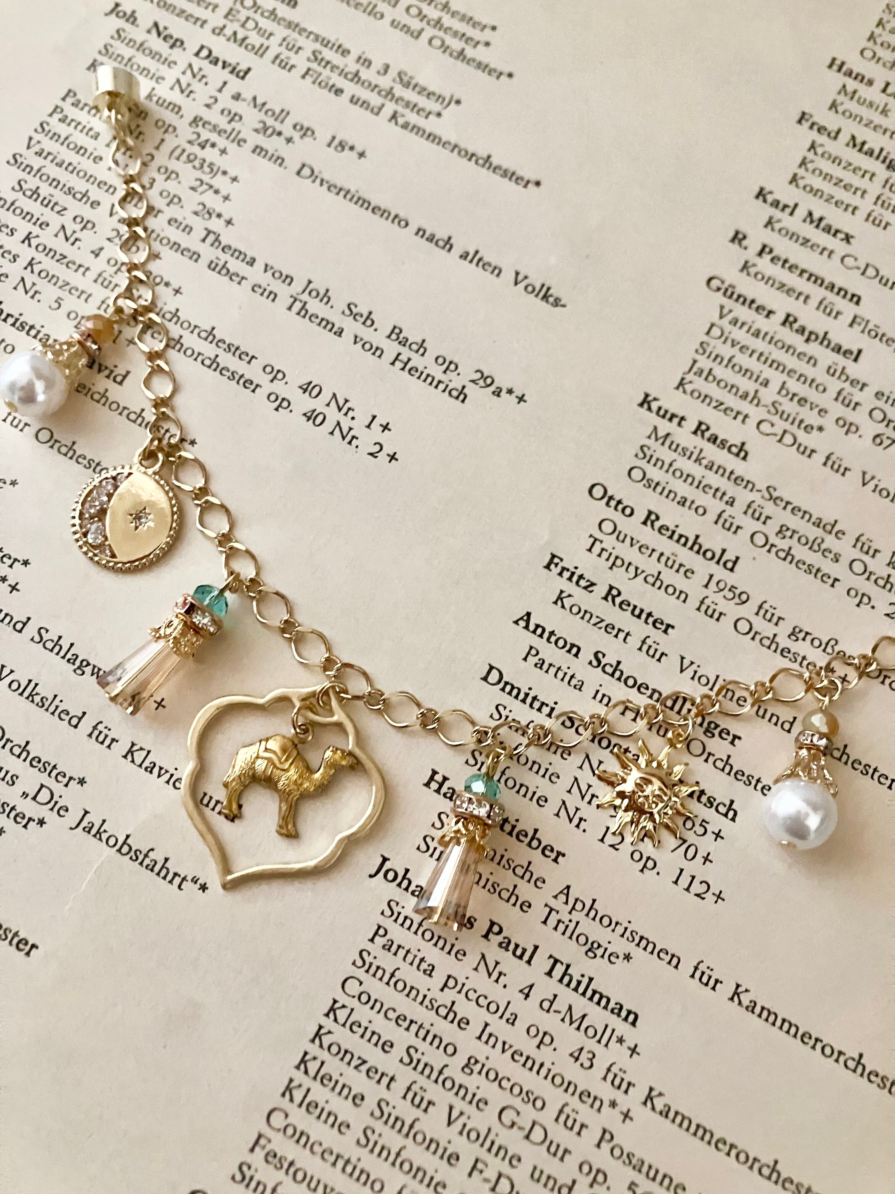 細目チェーンのブレスレットにラクダ・タワー・月・太陽・パールのチャームをあしらい、華奢でありつつ異国情緒を纏った砂塵を感じるデザインに仕立てました。